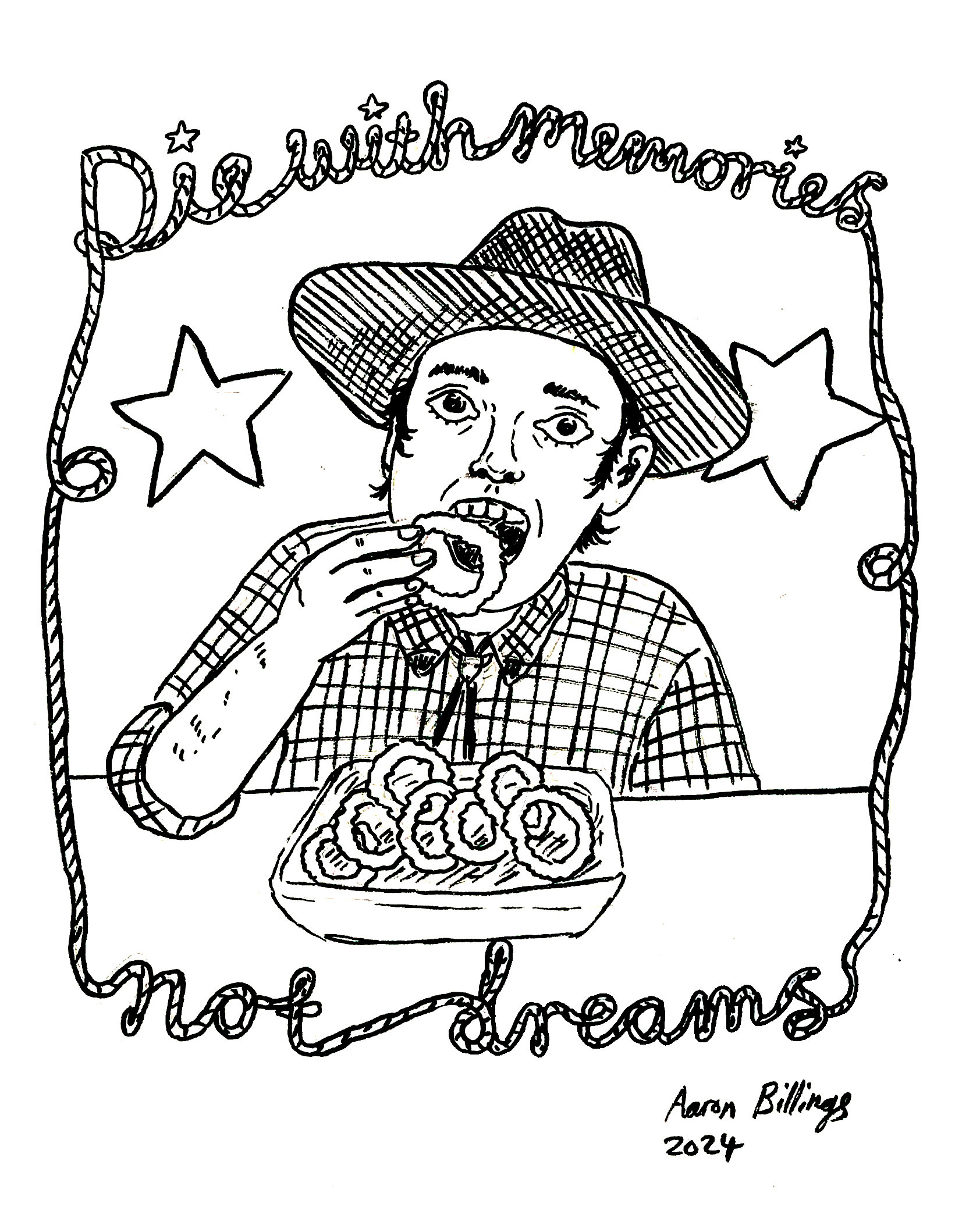 There is a mechanical bull in the festival grounds. His name is Chainsaw and he has demonic red eyes. Some grip onto Chainsaw's neck with both hands. Others are more performative, throwing their hands and hats up in the air. The crowd rewards them with whooping cheers and whistles.